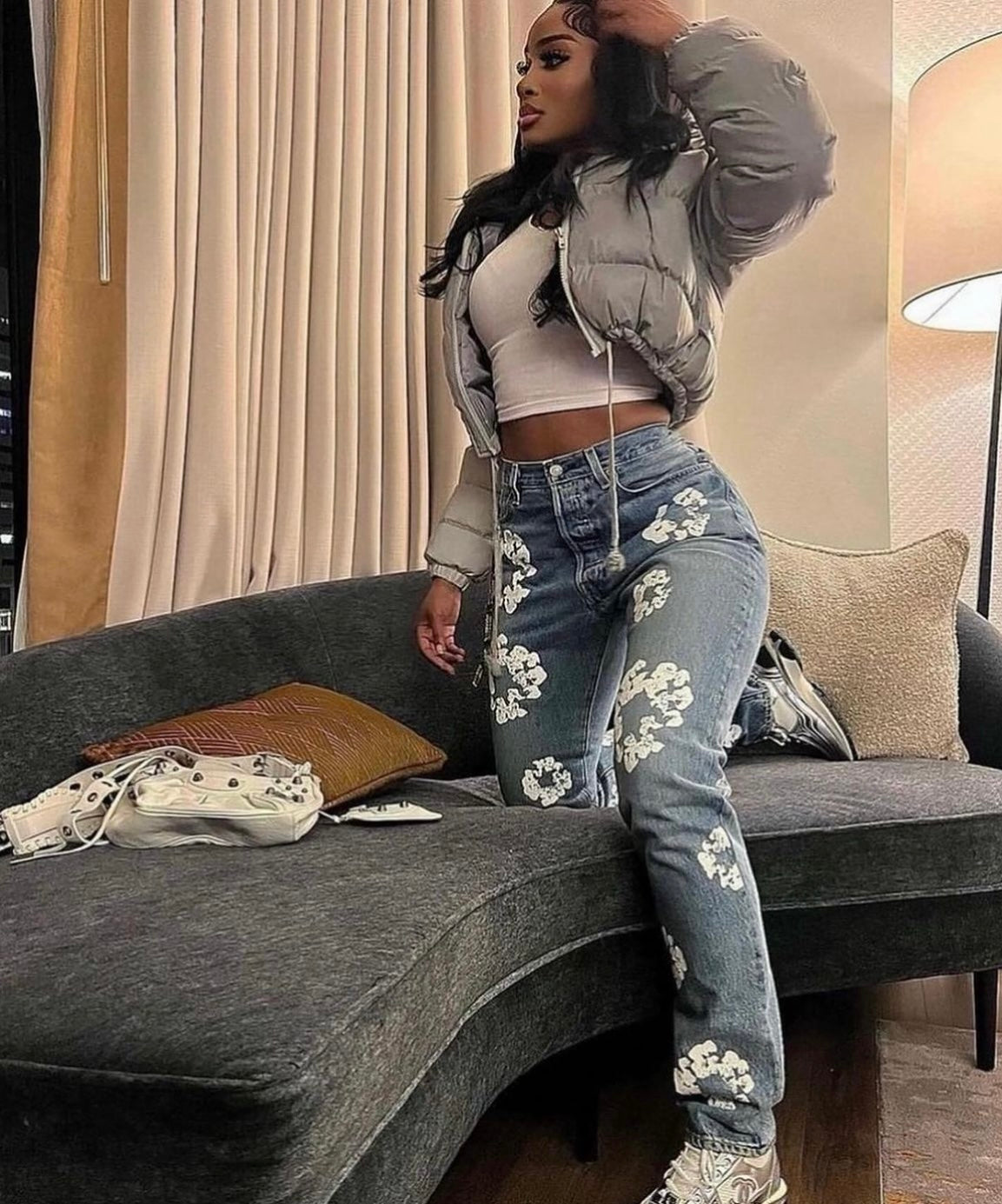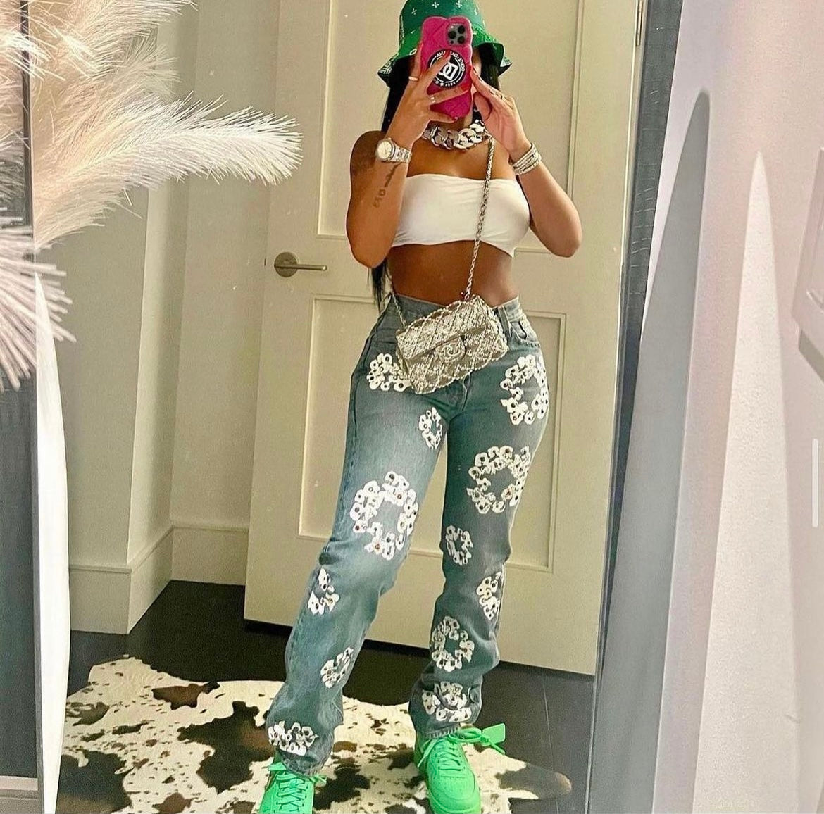 This product is made with a soft, non-stretchy material and features a floral print, high rise, straight leg, pockets, and a long fit. It can be dressed up for club and night out wear, or worn casually for a chic, street style look. Perfect for modern, young contemporary fashion.