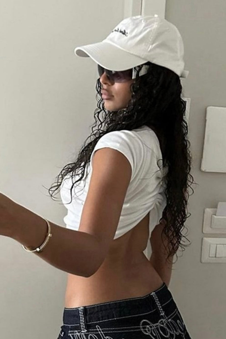 This cropped tee-shirt features a drawstring detail with a letter print.