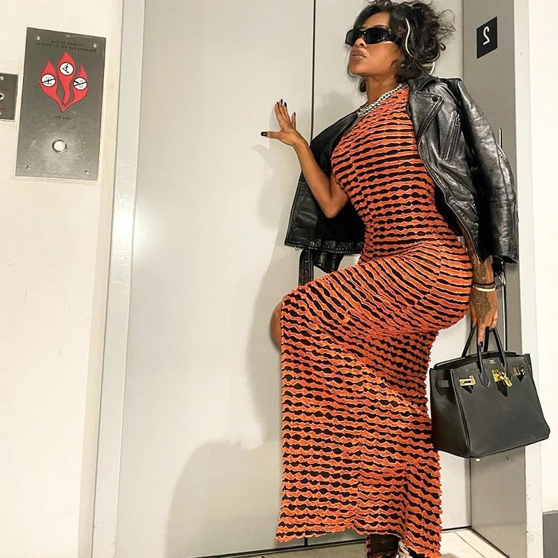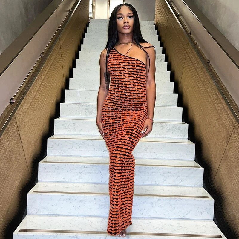 This reversible sleeveless dress features a one-shoulder split and a two-tone contrast color design with ruffles.
