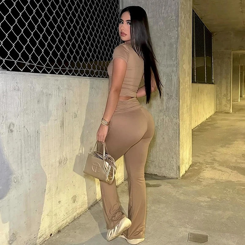 This outfit consists of a cropped top with a round neckline and slim-fit pants, which are made of a blend of polyester and spandex.